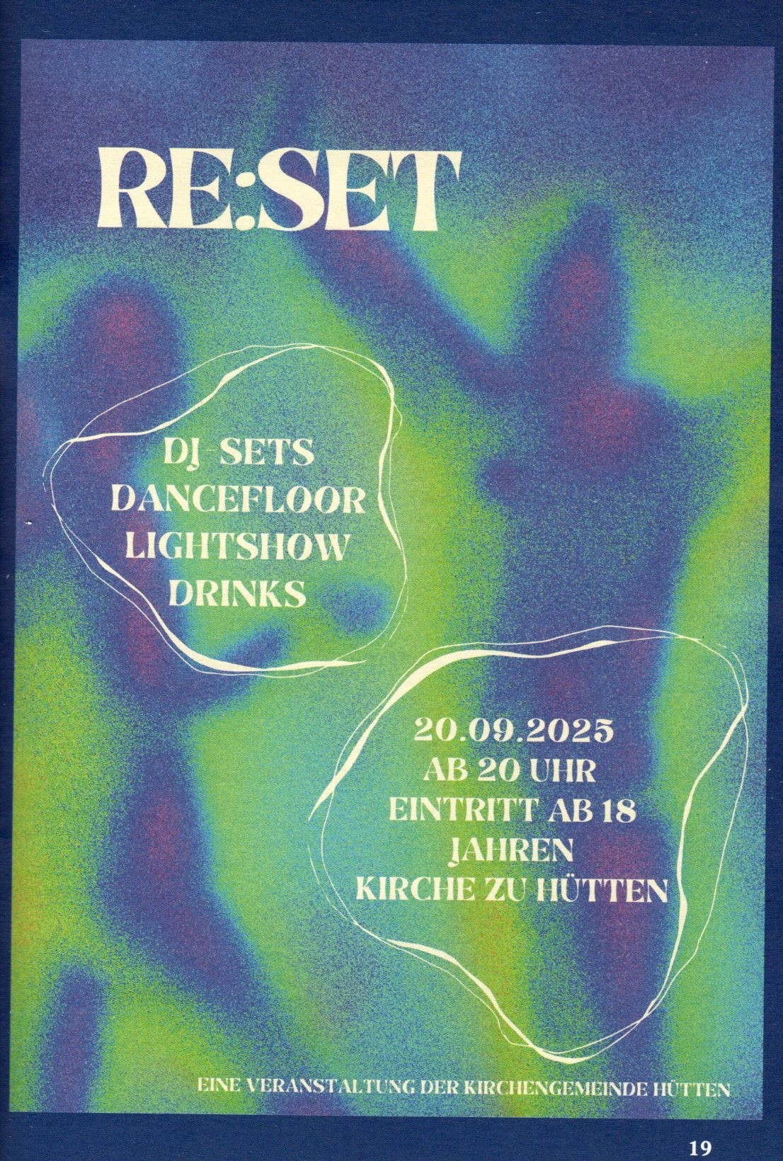 Am 20.9. ab 20:00 findet in der Hüttener Kirche ein RE:SET mit DJ Sets, Dancefloor, Lightshow und Drinks statt. Eintritt ab 18 Jahren