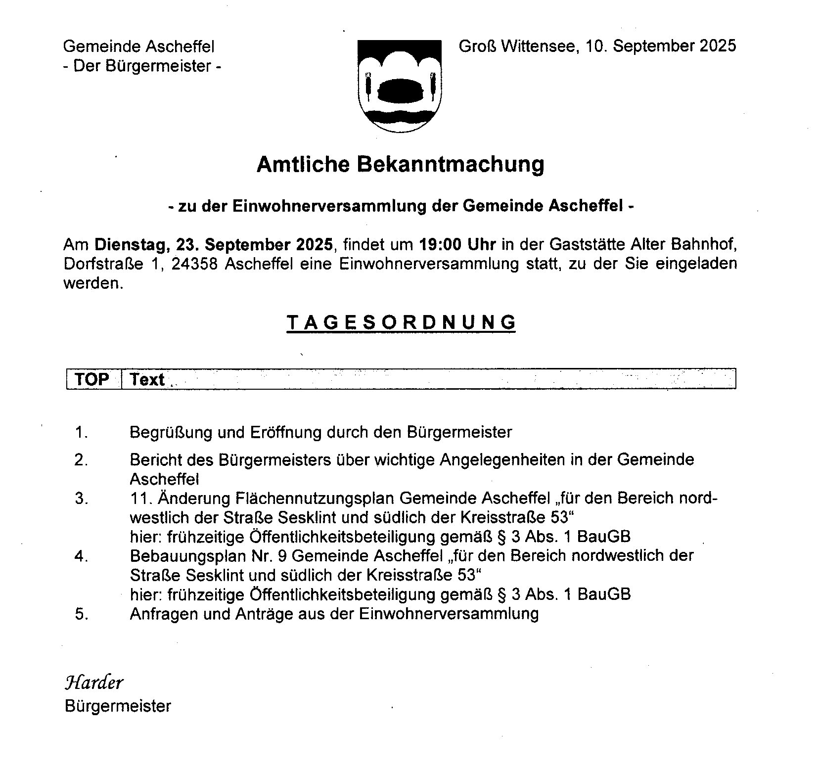 Am Dienstag, 23. September 2025 findet um 19:00 Uhr in der Gaststätte Alter Bahnhof, Dorfstraße 1, 24358 Ascheffel eine Einwohnerversammlung statt.