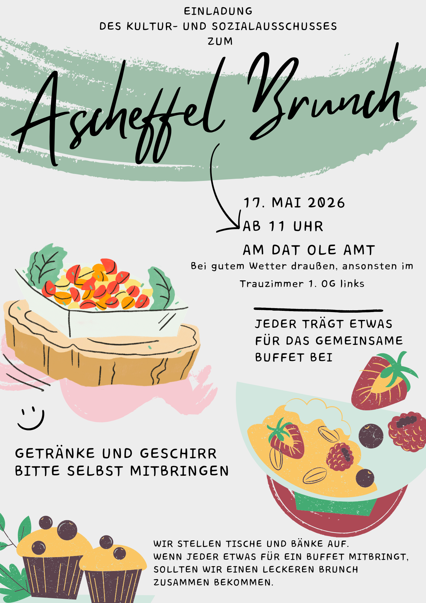 Am 17.5. ab 11:00 findet der nächste Brunch vor dem Olen Amt statt. Der Kulturausschuss sorgt für Tische und Bänke, ansonsten bringt jeder sein eigenes Geschirr und Besteck mit und etwas fürs gemeinsame Büffet.