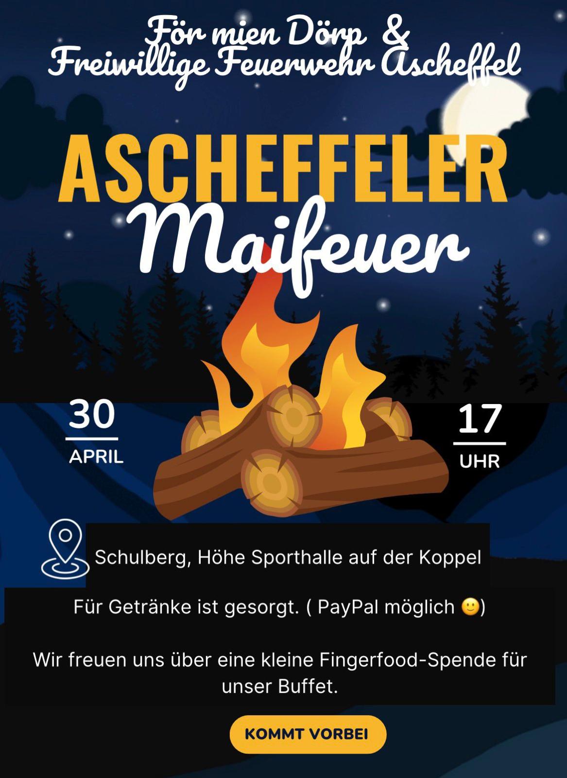 Am 30. April veranstalten "För mien Dörp" und die Freiwillige Feierwehr Ascheffel ein Maifeuer. Beginn 17:00 Uhr