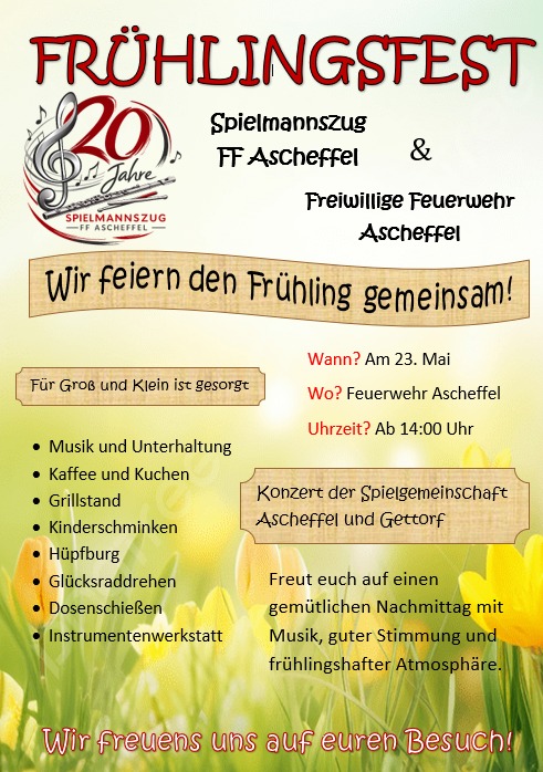 Frühlingsfest der Feuerwehr und des Spielmannszuges am 23.5. ab 14:00 Uhr. Ort: Feuerwehr Ascheffel